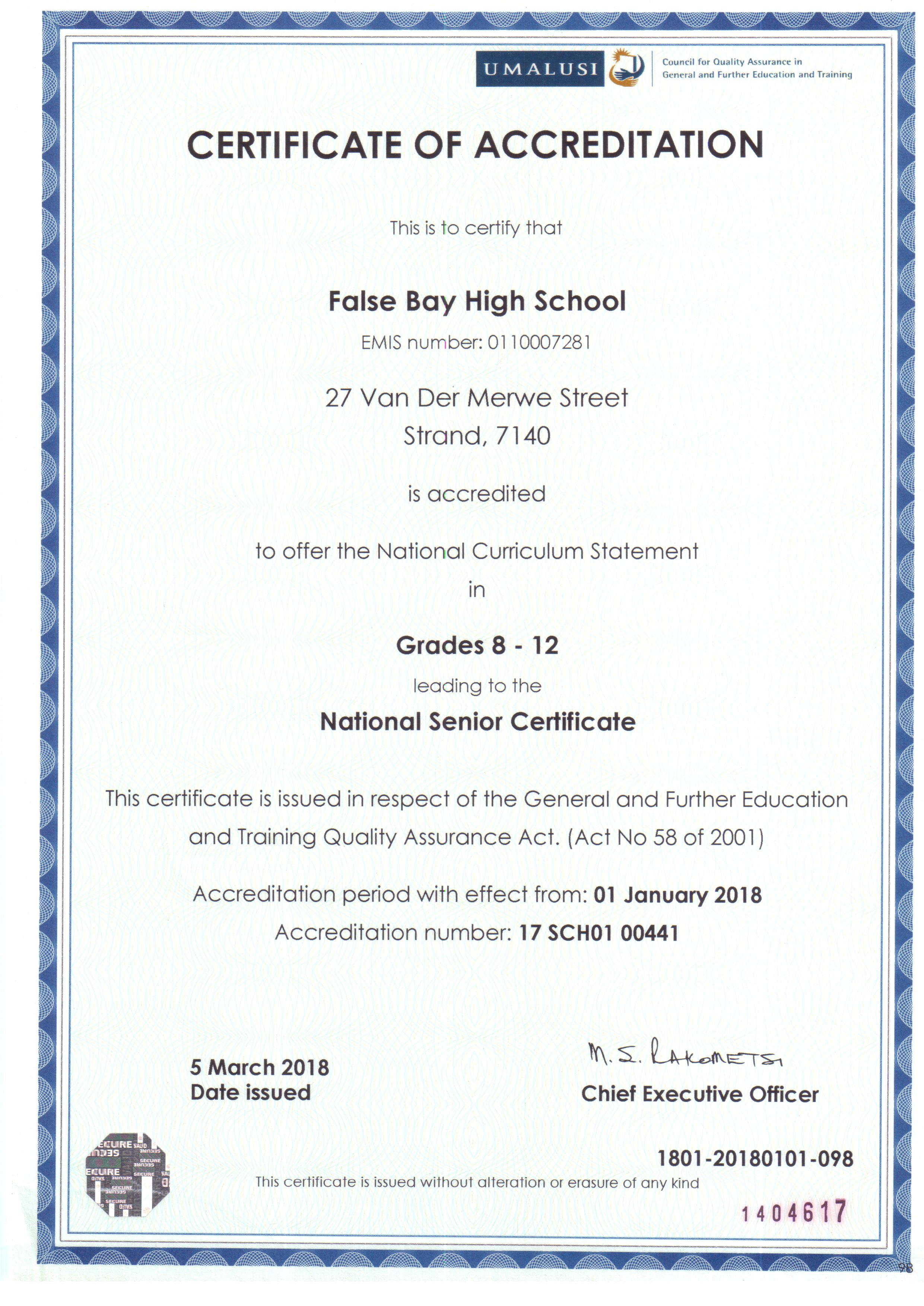 False Bay High School is registered with the Department of Education and accredited by UMALUSI’s Council of Quality Assurance.