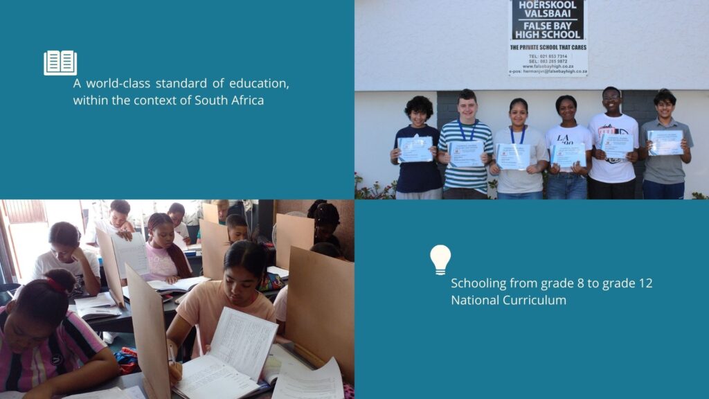 Afrikaans, English, Mathematics, Mathematical Literacy, Physical science, Life Science (biology), Geography, History, Tourism, Computer Studies (CAT), Visual Art (photography, painting, drawing, etc), Design, Business Studies, Life Orientation, Accounting